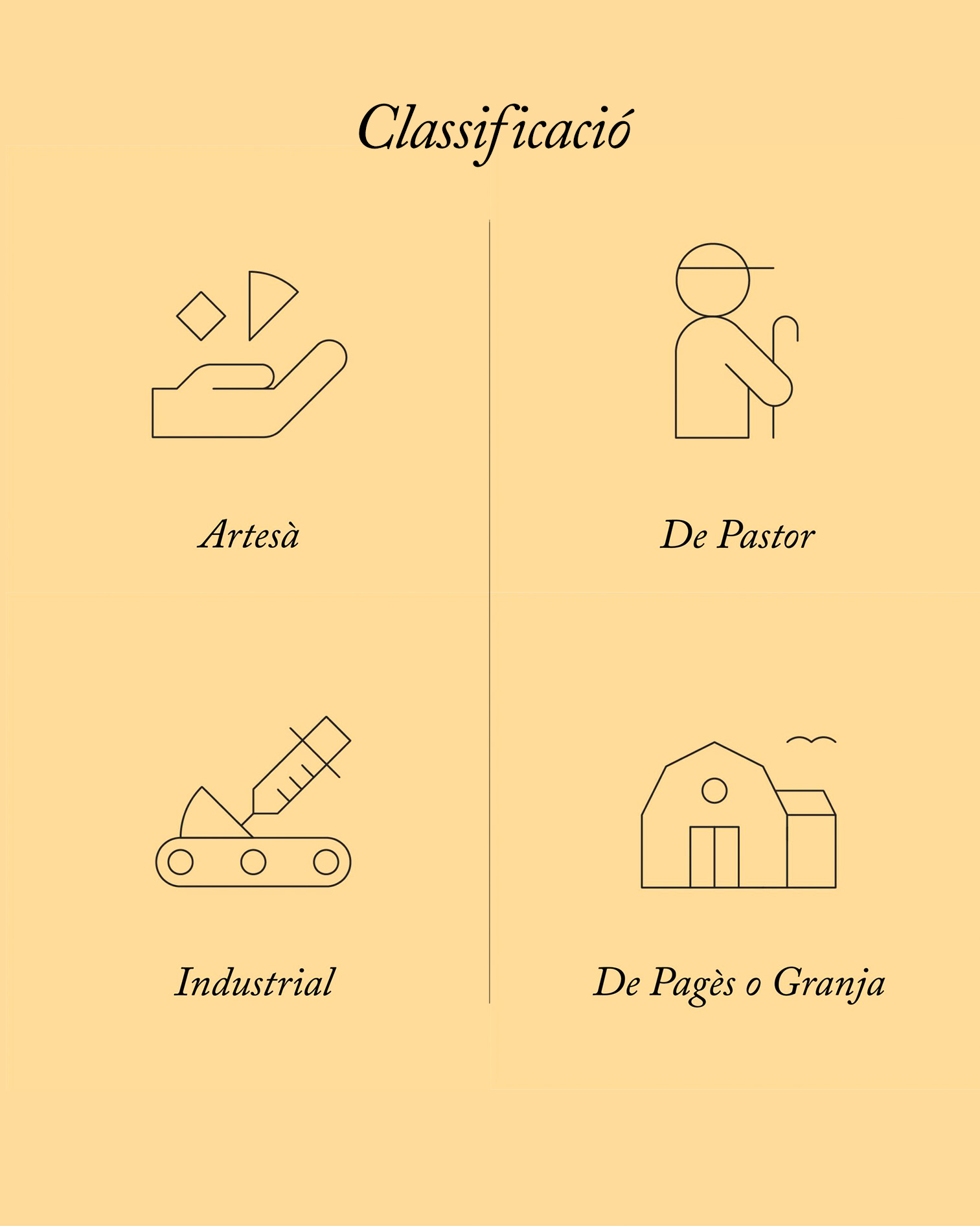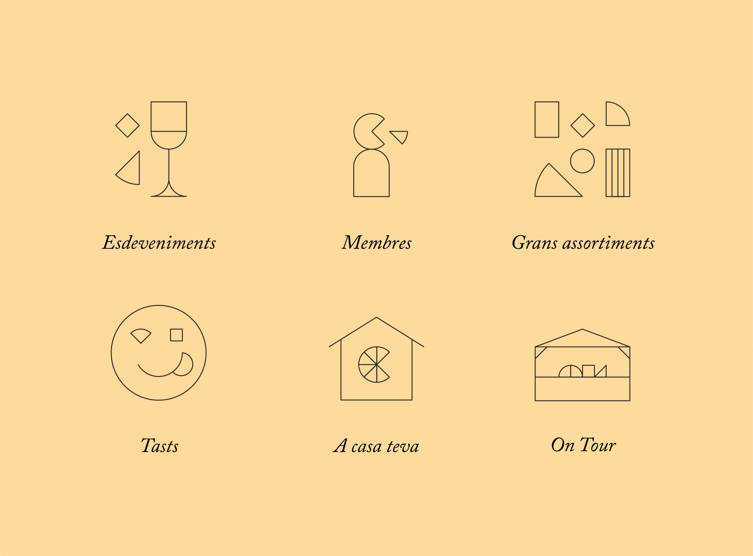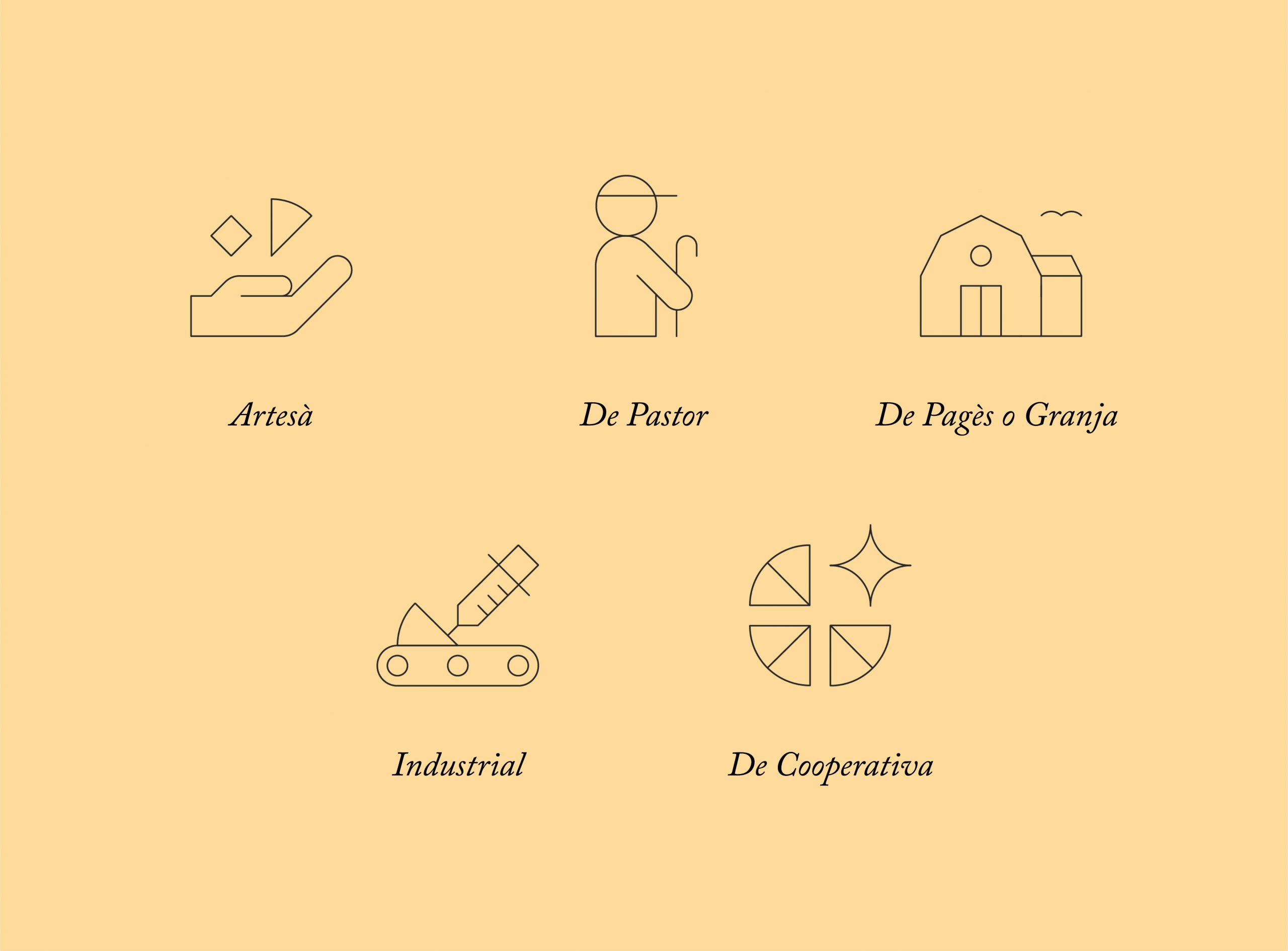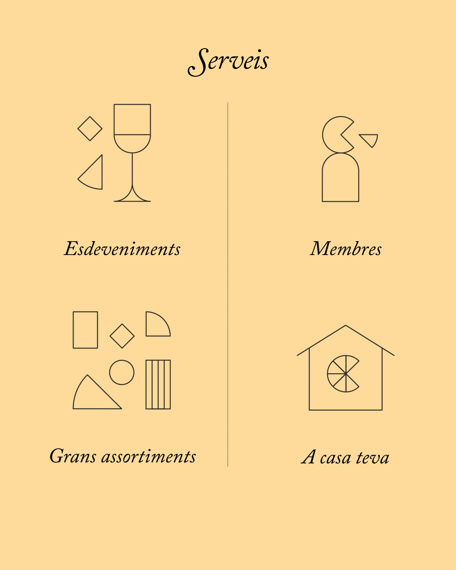 Partint de la fragmentació del formatge, s’ha dissenyat un sistema visual geomètric que permet il·lustrar de manera simple diferents categories de productes i serveis que ofereix el projecte de Cal Formatger.