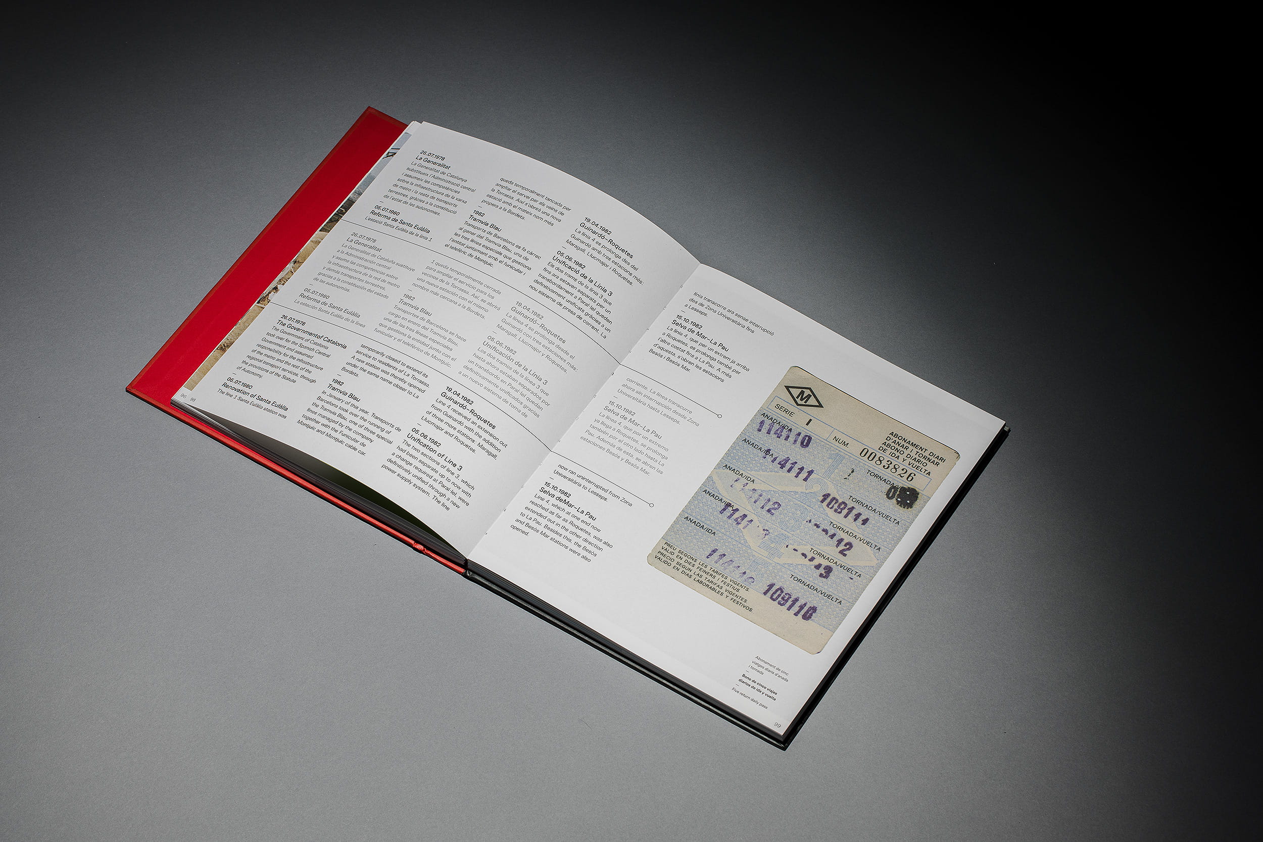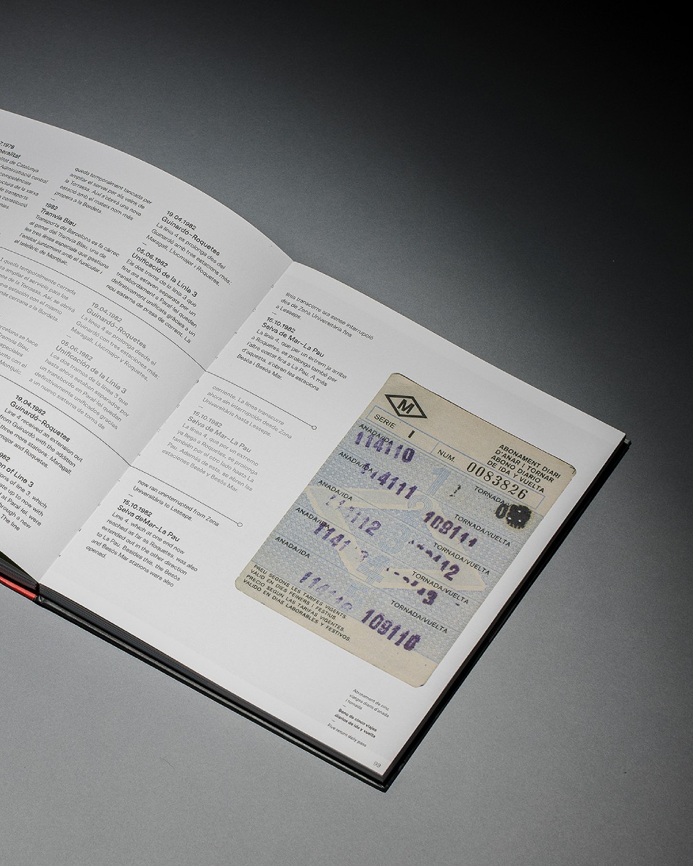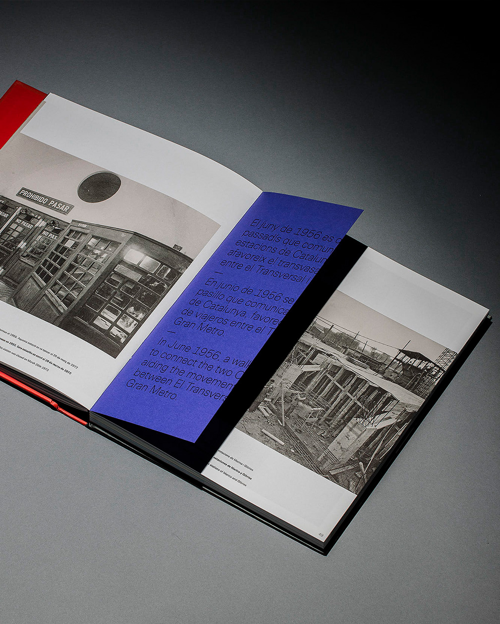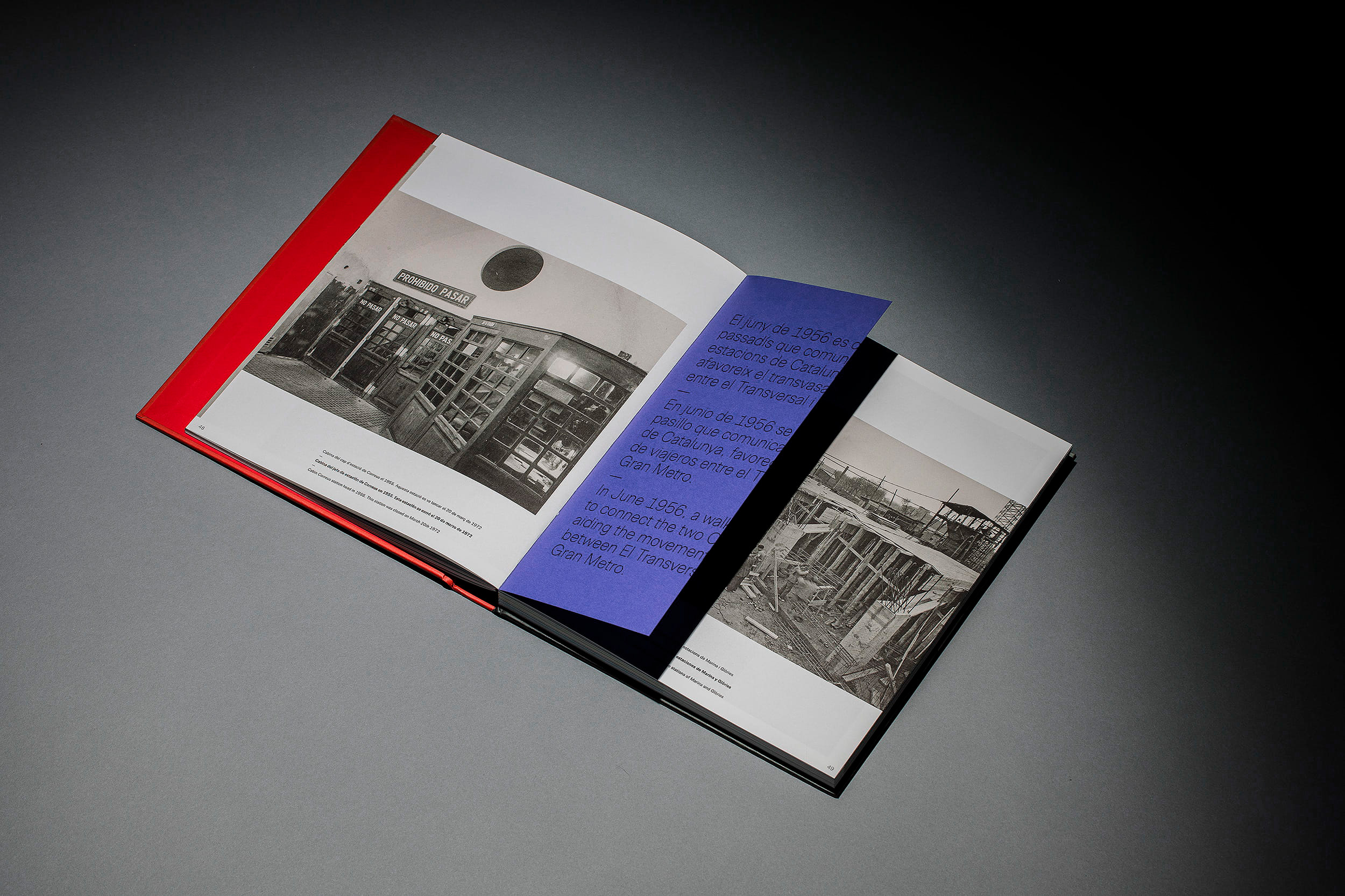 Un traçat visual que pren forma en la mateixa maquetació, diferenciada en tres llengües mitjançant un separador que aporta continuïtat al llarg de la lectura d’aquest volum. El disseny tipogràfic de l’inici de capítol també referma la comparativa amb les línies del metro. Aquest recurs no només es manifesta en la maquetació, sinó també en l’estructura del llibre, on l’espina queda marcada pel color dels separadors interns, representant el conjunt de línies paral·leles que trobem als mapes identificatius del transport metropolità.
