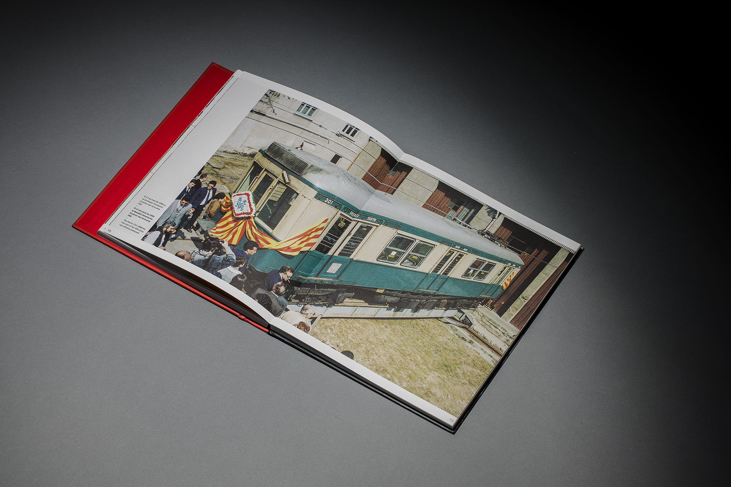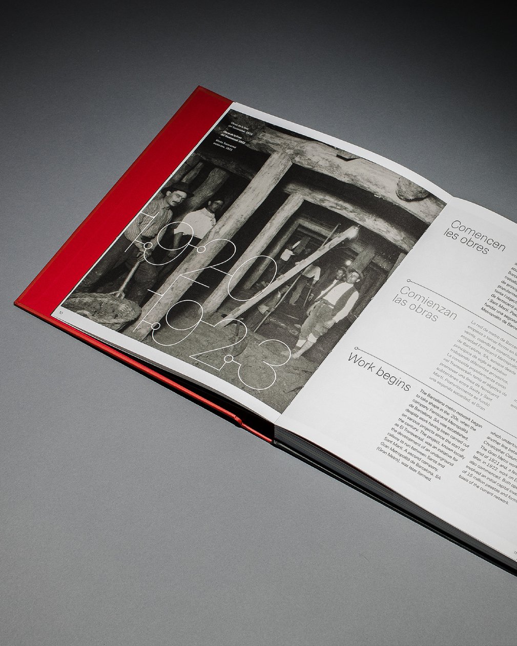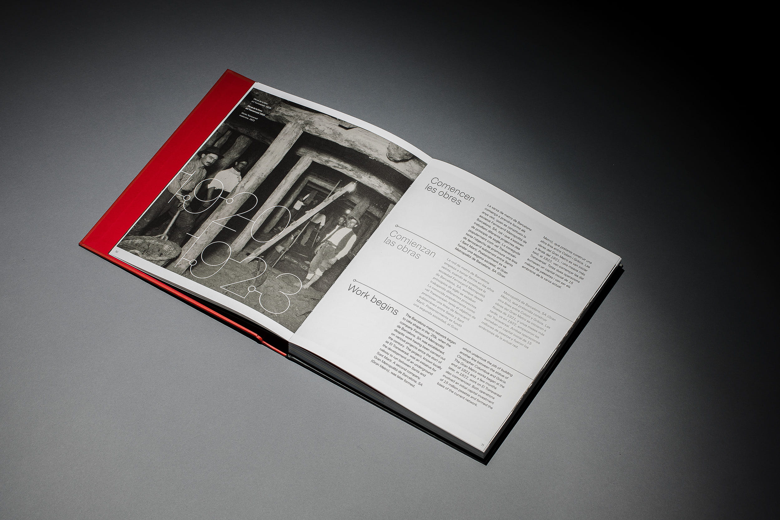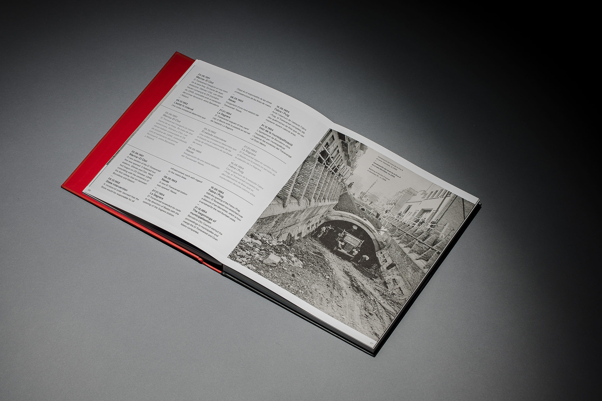 Un traçat visual que pren forma en la mateixa maquetació, diferenciada en tres llengües mitjançant un separador que aporta continuïtat al llarg de la lectura d’aquest volum. El disseny tipogràfic de l’inici de capítol també referma la comparativa amb les línies del metro. Aquest recurs no només es manifesta en la maquetació, sinó també en l’estructura del llibre, on l’espina queda marcada pel color dels separadors interns, representant el conjunt de línies paral·leles que trobem als mapes identificatius del transport metropolità.